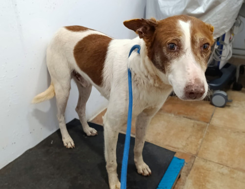 Met andere honden is hij heel goed, onderdanig, hij heeft geduld met andere zeer speelse honden, zelfs als ze op hem springen. Hij heeft alleen een beetje tijd nodig om zich aan te passen, om zijn angsten te overwinnen en het goede karakter te laten zien dat hij heeft. Het is minder dan een week geleden dat we hem gered hebben en we zien nog steeds dat, bijvoorbeeld, wanneer een onbekend persoon zijn kennel of park binnengaat, hij een minuut op afstand blijft observeren, met een blij kwispelende staart, maar eerst moet observeren om te weten of die persoon goed is of niet, en zodra hij vaststelt dat ze niets slechts gaan doen, is hij degene die naar hen toe komt, ruikt en knuffels zoekt. Makkelijk, geschikt voor beginners, zolang ze maar begrijpen dat hij zich in het begin onzeker kan voordoen in nieuwe situaties, ongeacht of hij alleen is of met andere honden.
