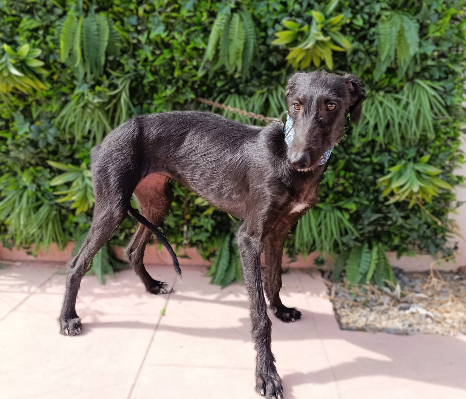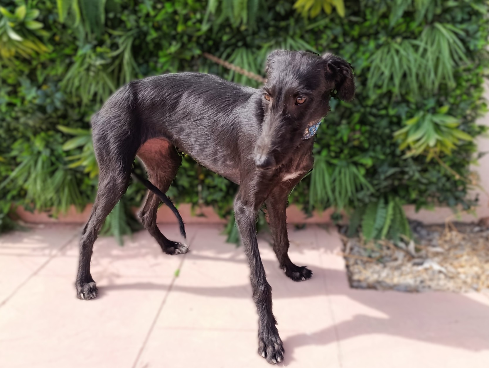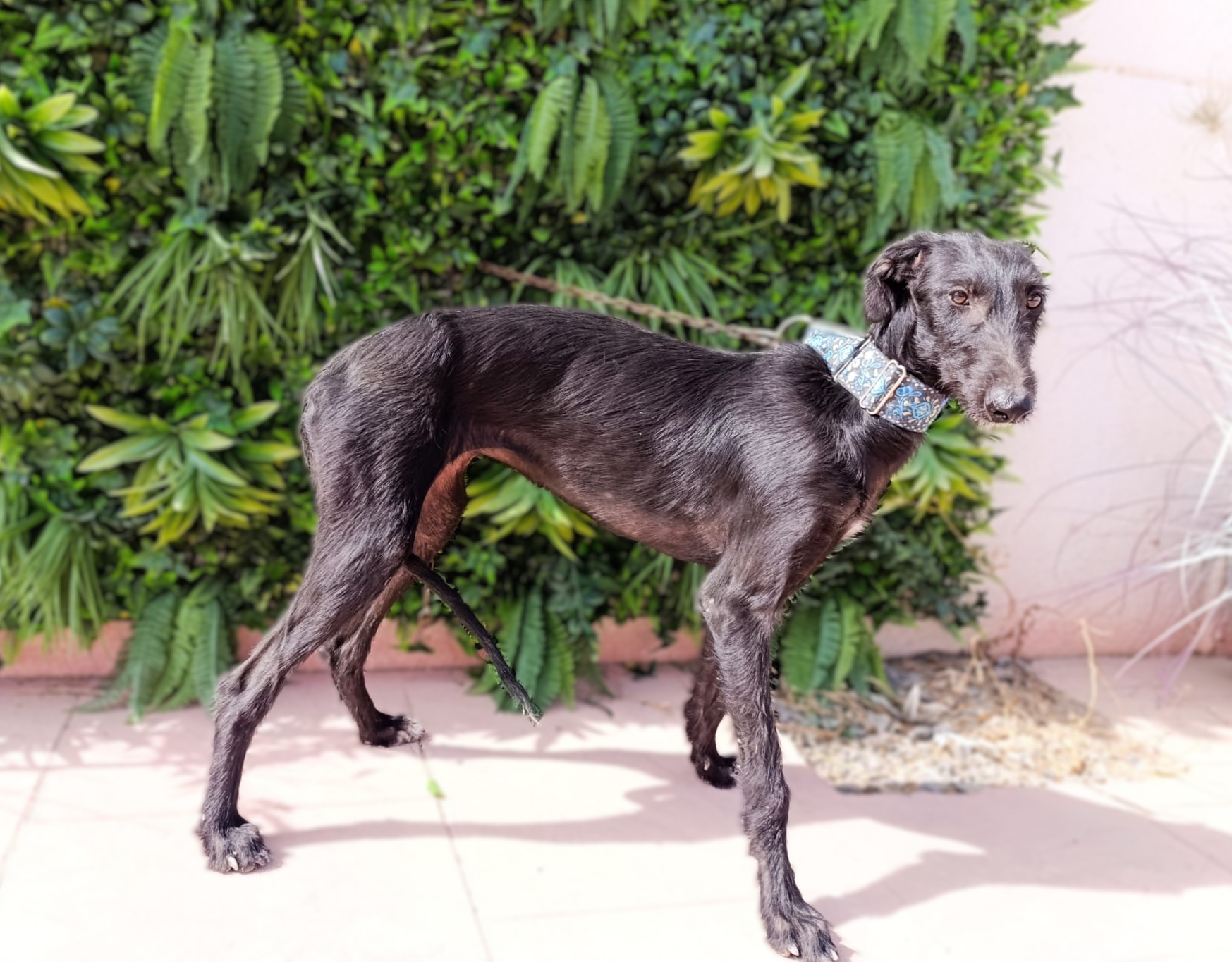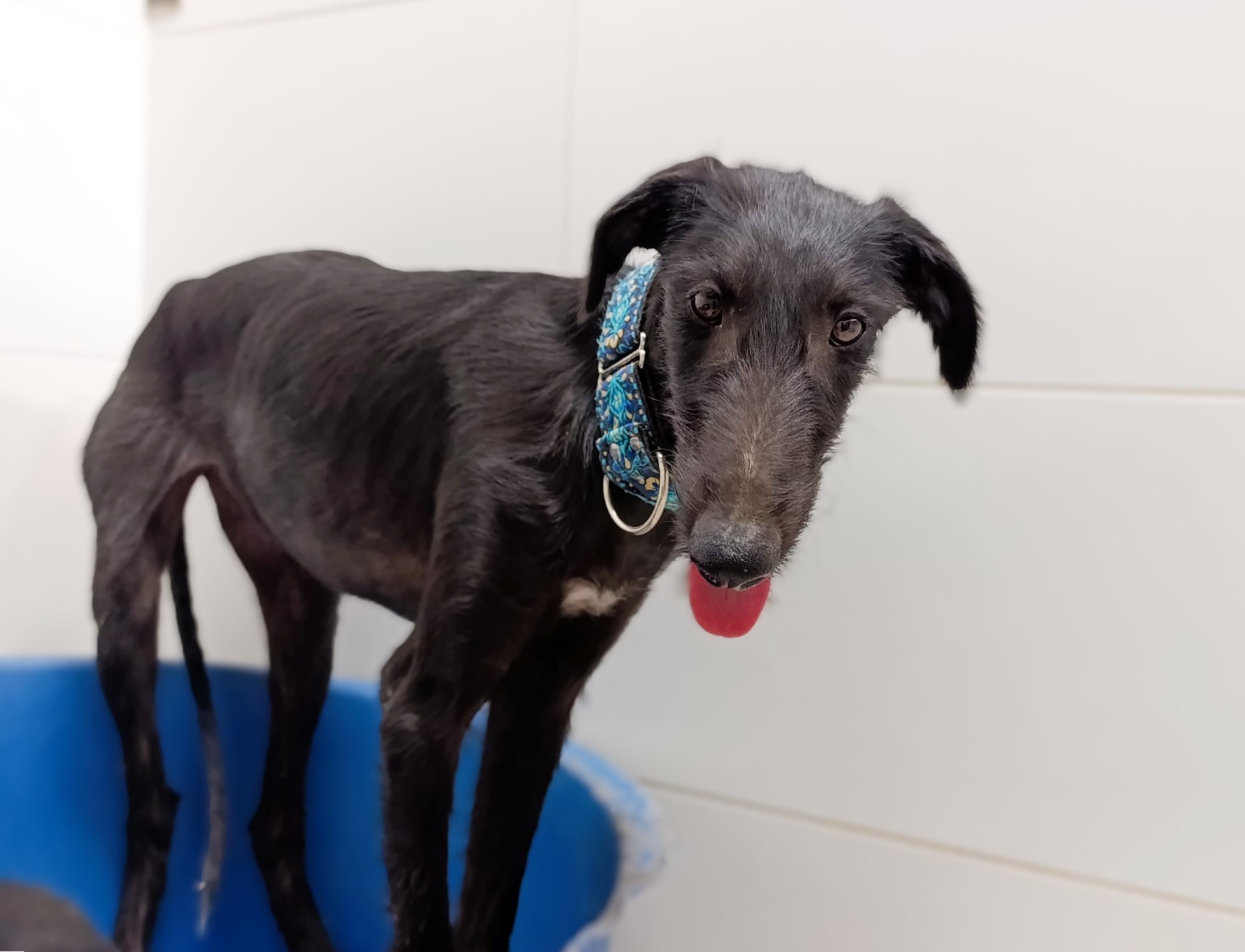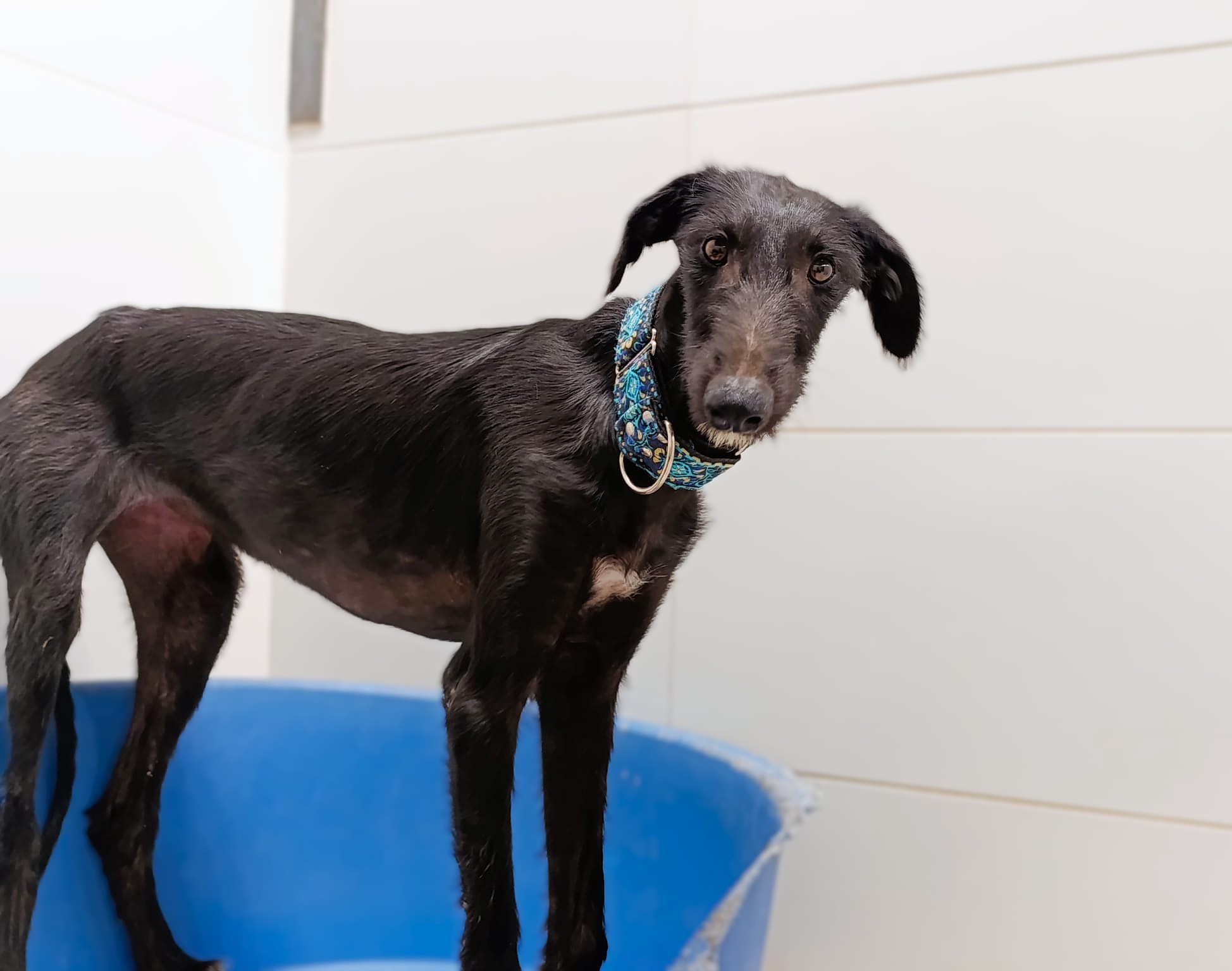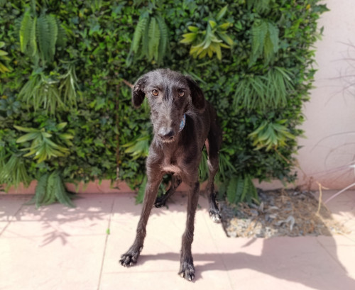 Nelia is een timide meisje maar herstelt goed. Ze is erg aanhankelijk en houdt van aanraking. Het is een rustige hond, zeker gezien haar leeftijd. Naar verwachting zal ze wel nog wat actiever worden naarmate ze meer open bloeit. In het begin kwam ze heel timide naar de shelter, ze wilde niet aan een riem lopen en kwam niet naar mensen toe voor aaitjes. Al na slechts 3 dagen zagen we een enorme verandering; hoewel ze nog steeds timide is, is ze erg nieuwsgierig en probeert ze zelf dichter bij mensen te komen voor aandacht. Wanneer ze alleen is, is ze nog steeds onzeker, maar als ze omringd is door andere honden is ze veel gelukkiger en lijkt ze blijer. Met andere honden is ze heel goed, ze is onderdanig en volgt. Nelia is geschikt voor mensen/ gezinnen met ervaring met galgo's die onzeker zijn en die een evenwichtige andere hond thuis hebben zodat ze van hem kan leren en sneller kan wennen. Bent u op zoek naar een zwarte nog ietwat ruwe diamant?