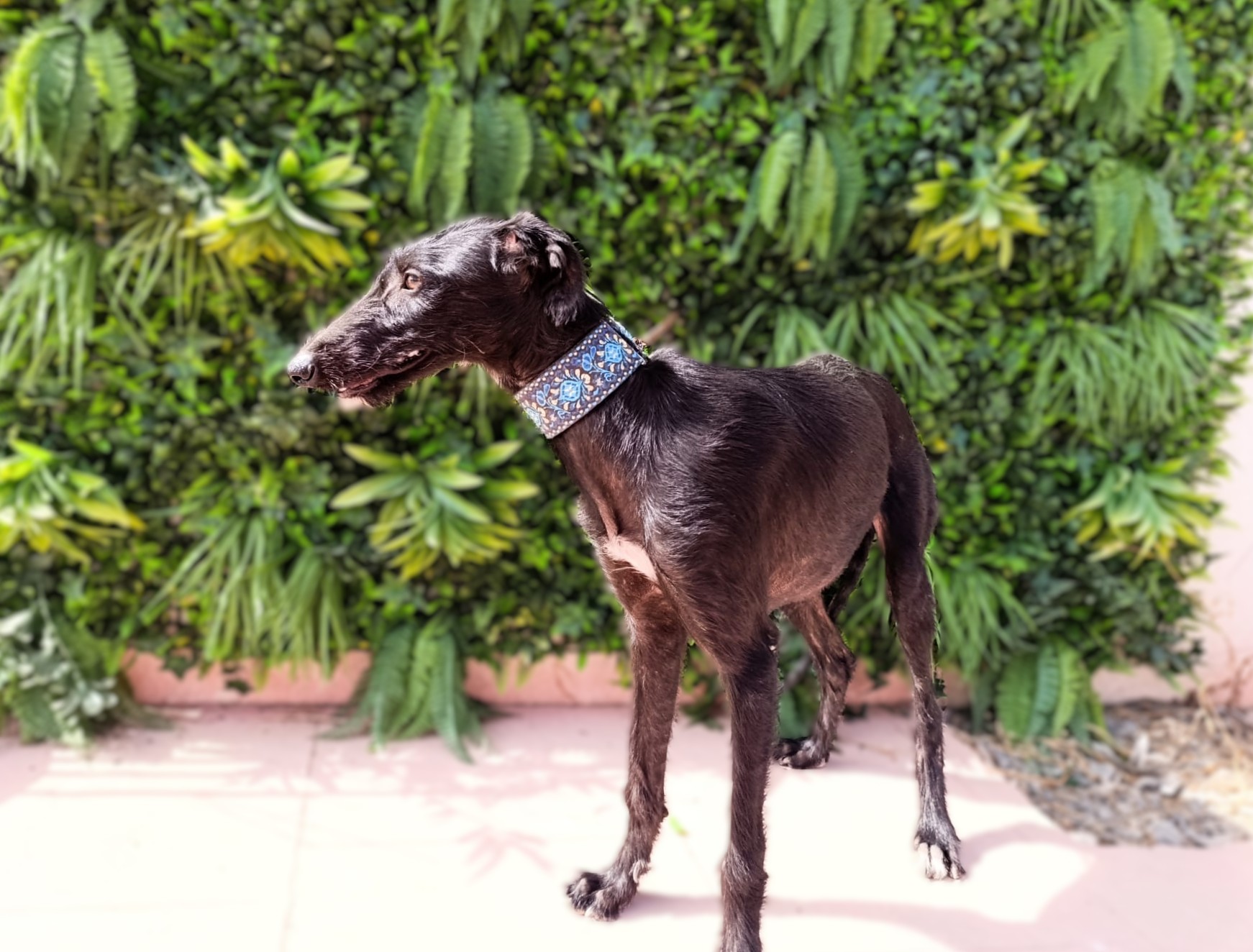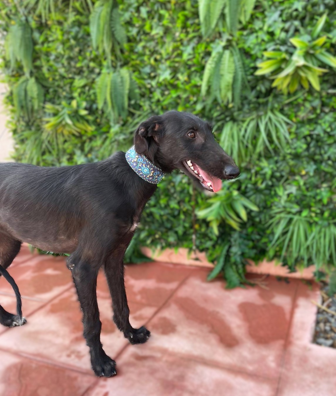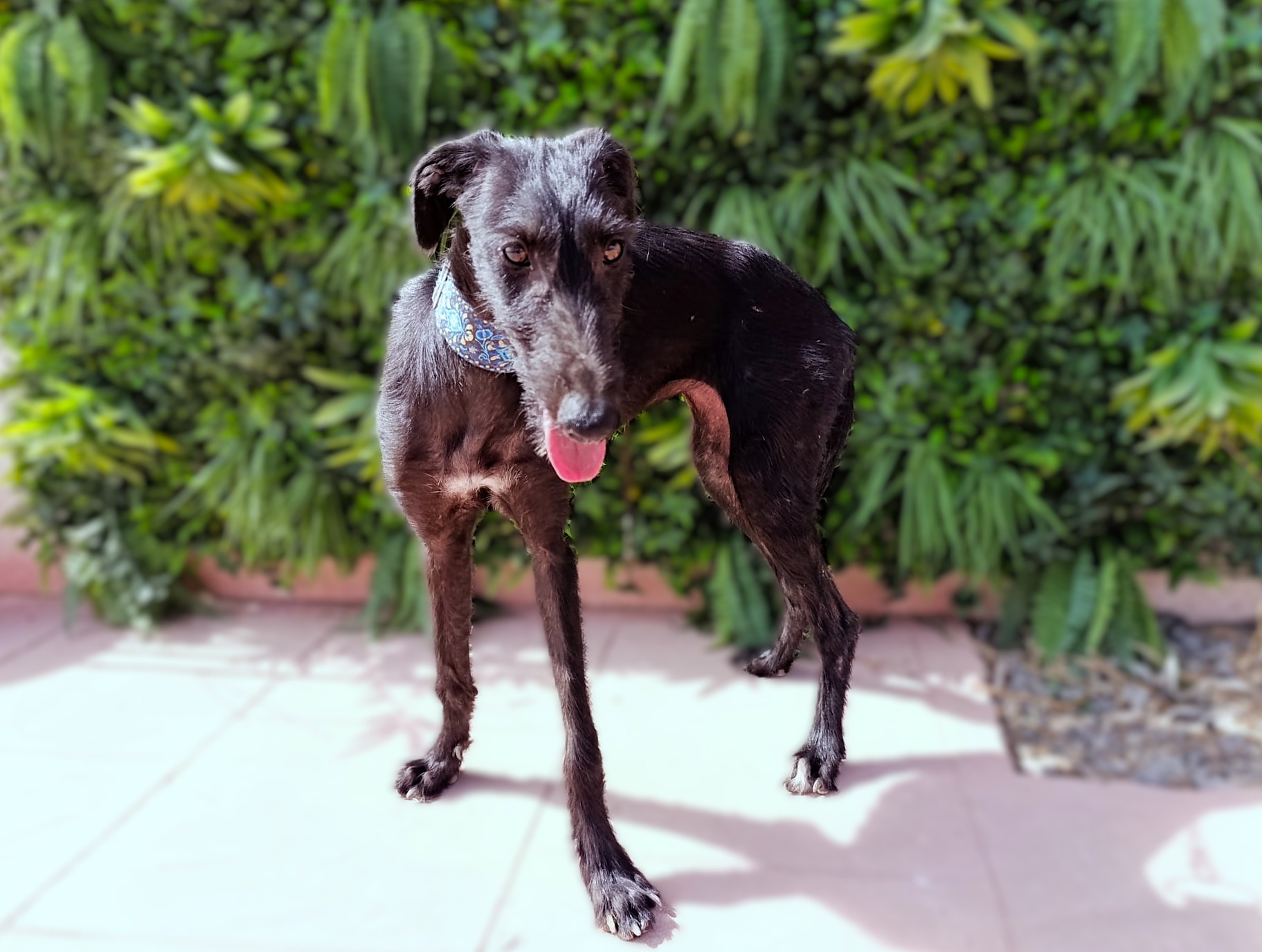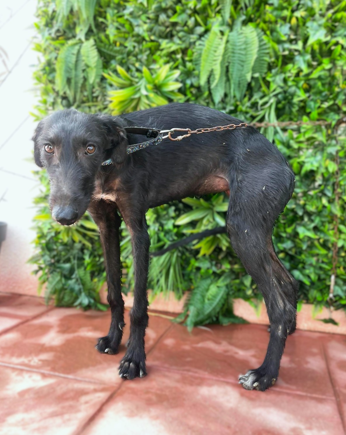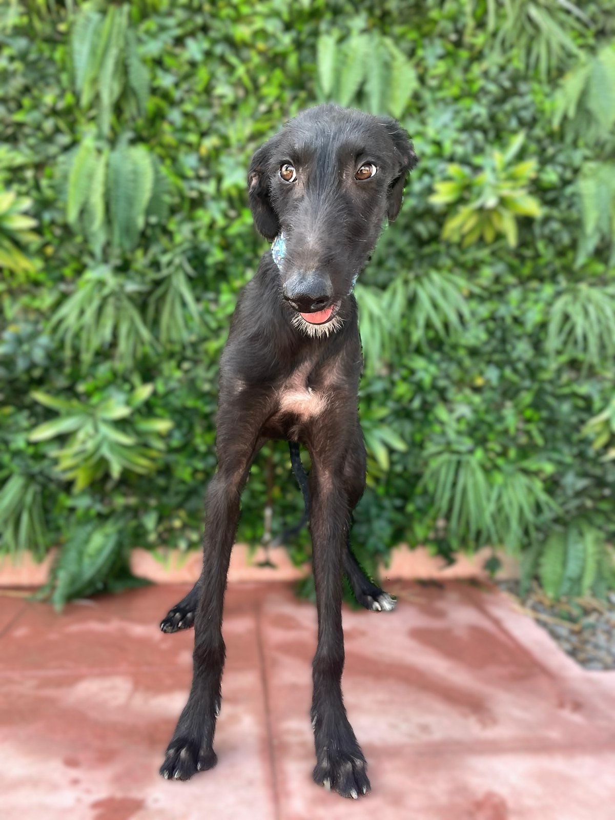 Nelia is een timide meisje maar herstelt goed. Ze is erg aanhankelijk en houdt van aanraking. Het is een rustige hond, zeker gezien haar leeftijd. Naar verwachting zal ze wel nog wat actiever worden naarmate ze meer open bloeit. In het begin kwam ze heel timide naar de shelter, ze wilde niet aan een riem lopen en kwam niet naar mensen toe voor aaitjes. Al na slechts 3 dagen zagen we een enorme verandering; hoewel ze nog steeds timide is, is ze erg nieuwsgierig en probeert ze zelf dichter bij mensen te komen voor aandacht. Wanneer ze alleen is, is ze nog steeds onzeker, maar als ze omringd is door andere honden is ze veel gelukkiger en lijkt ze blijer. Met andere honden is ze heel goed, ze is onderdanig en volgt. Nelia is geschikt voor mensen/ gezinnen met ervaring met galgo's die onzeker zijn en die een evenwichtige andere hond thuis hebben zodat ze van hem kan leren en sneller kan wennen. Bent u op zoek naar een zwarte nog ietwat ruwe diamant?
