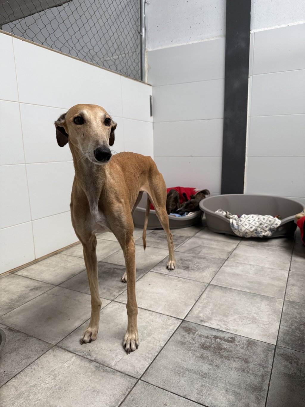 Belen is een zeer lieve galgo, sociaal, zonder angsten, met een evenwichtig karakter en heel makkelijk. Ze is vrolijk en sympathiek, maar gedraagt zich geweldig, zonder angst te laten zien in de shelter, vrij rustig hoewel ze altijd erg blij wordt als iemand haar komt begroeten en haar staart blij kwispelt terwijl ze naast je rent, hoewel ze daarna gewoon rustig naast je been gaat zitten zodat je haar kunt aaien. Met andere honden is ze zeer goed, sociaal, onderdanig, het maakt niet uit of de andere honden actiever zijn dan zij. Makkelijk, geschikt voor beginners, het maakt niet uit of ze alleen is of met andere honden.