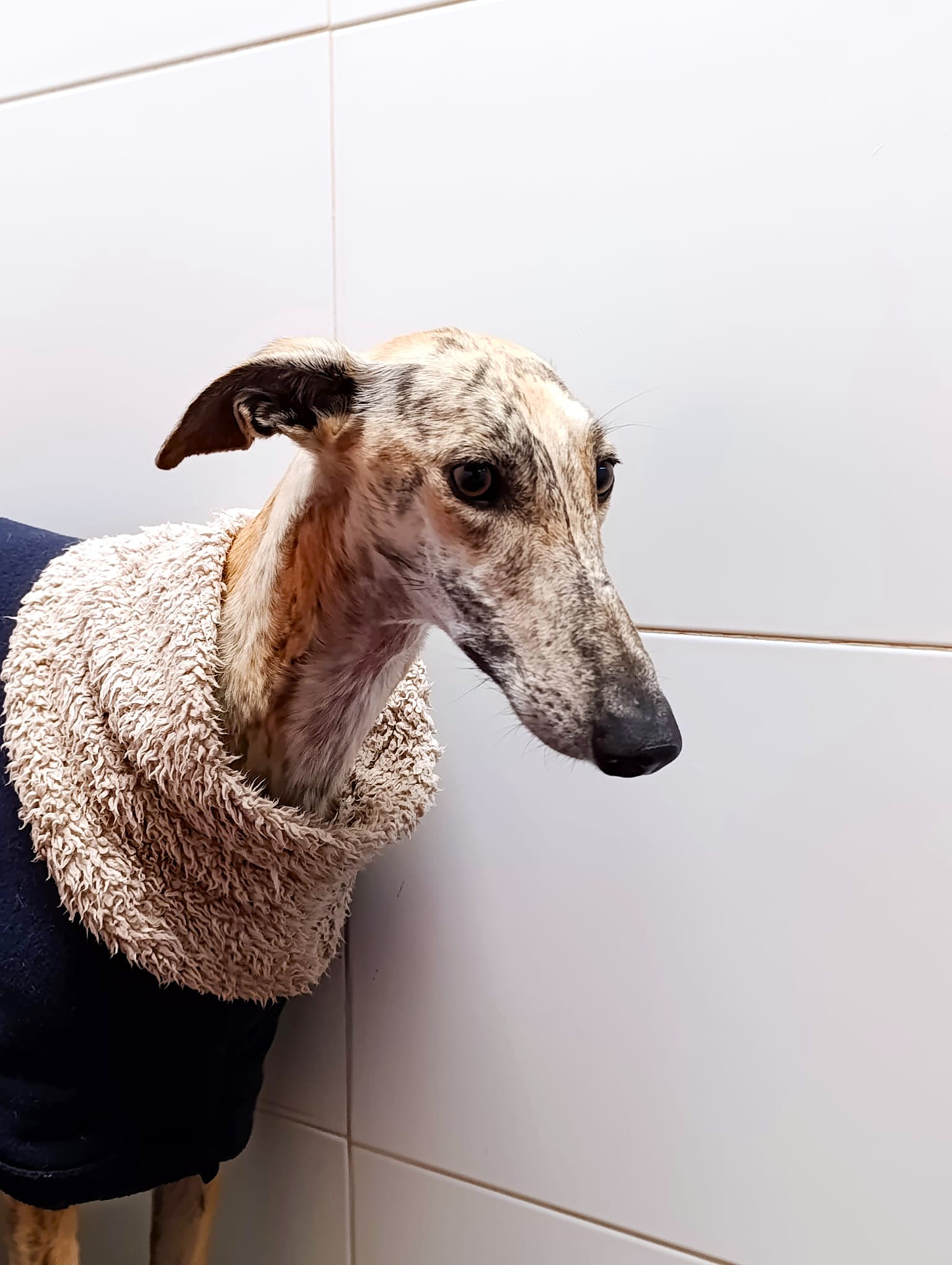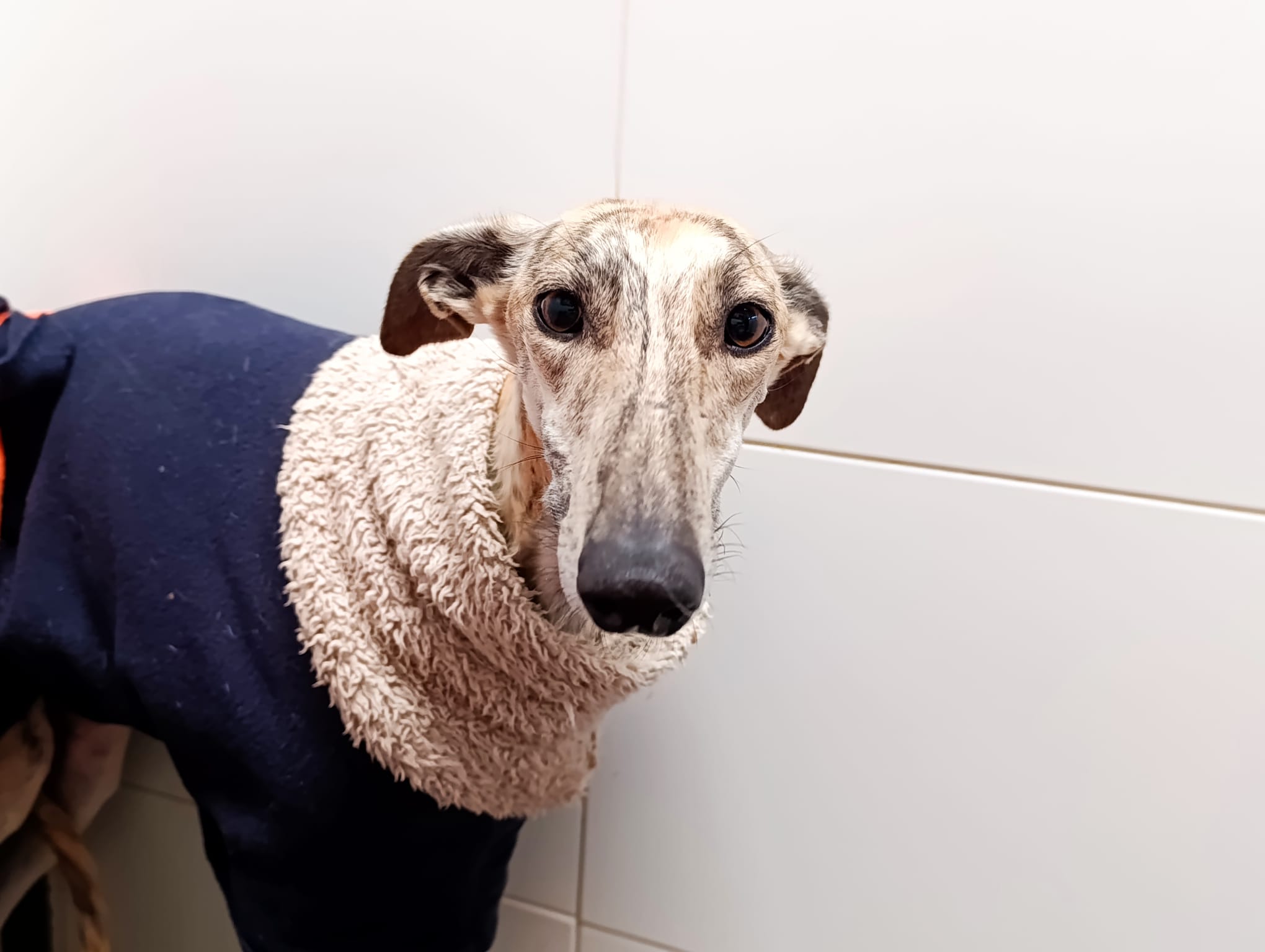 Mika is een prachtige windhond met een bange aard. Ze is erg zachtaardig, maar heeft tijd nodig om te wennen aan veranderingen en om te leren vertrouwen. Tegenover de mensen die haar dagelijks voeren is ze handelbaar, ze kan goed aan de lijn wandelen en toont zich zelfverzekerder, hoewel ze nog steeds een verlegen karakter heeft. Wanneer een onbekende probeert haar te aaien, blijft ze simpelweg verstijfd van angst. Tegenover andere honden is ze heel goed en erg onderdanig. Ze is een bange windhond en het meest geschikt voor families die ervaring hebben met windhonden en begrijpen dat ze in het begin tijd en geduld nodig zal hebben om aan haar nieuwe leven te wennen, en het is beter als er een andere sociale hond in huis is die haar helpt sneller te leren.