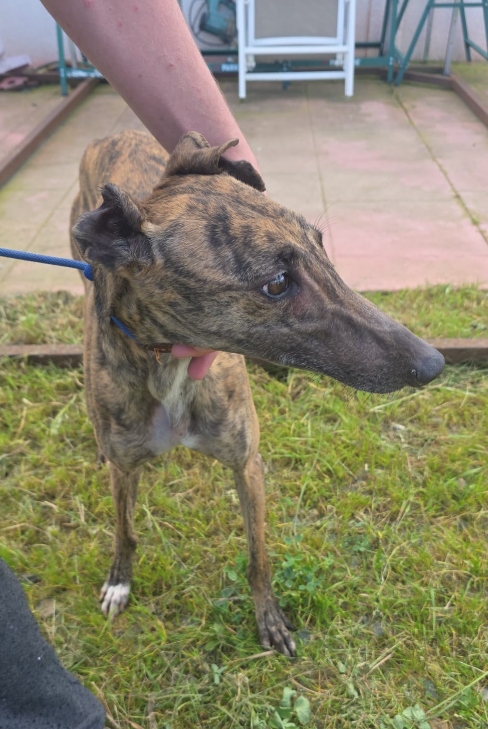 Sula is een windhond met een verlegen karakter, niet extreem bang maar ze heeft tijd nodig om zich aan veranderingen aan te passen.
