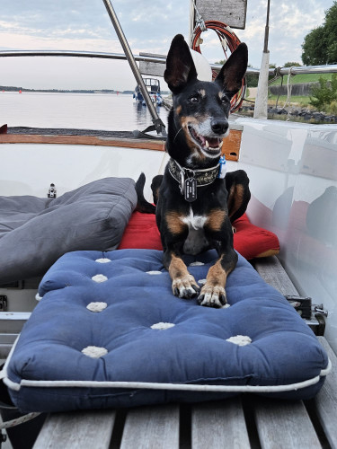Hij vond de zeilvakantie eigenlijk heel erg leuk ondanks dat de tochten soms best wel lang waren. Hij deed het verbluffend goed. Je zal maar ruim 10 jaar zijn en het huis, jouw mand alles gaat schuin en dat niet alleen het gaat ook nog eens op en neer en heen en wee,r maar Boeddha is een slim hondje. Hij wist precies dat als we overstag (over de andere boeg gaan liggen) gingen dan kroop hij snel naar de andere kant zodat hij de beste plek aan de lage kant had 😊.
